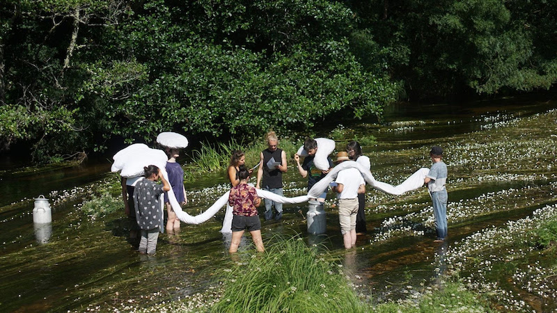 Commissioned artworks include Ash Arder‘s INT. HOME(S) (2023/2026), an expanded sculptural installation made from parts of a 1987 Cadillac Sedan de Ville—her family’s childhood car—featuring a new multi-channel video that traces the artist’s Detroit childhood and her relationship with the automobile. Tania Candiani’s Two Waters (2026) is a large-scale filmed performance created with composer Rogelio Sosa and hundreds of local volunteers, inspired by Medina’s aqueduct, where the Erie Canal crosses above Oak Orchard Creek—two waters that never touch. Futurefarmers (Amy Franceschini, Michael Swaine, and FS Bàssïbét) present 48 Collections from the Erie Canal (2026), a three-part installation that begins with a local legend and expands outward through collective memory. Working with residents, the artists gathered oral histories and archival fragments, translating them into sound and video works, as well as a series of glass sculptures that encase canal sediment. Matt Kenyon‘s The TELL (2026) reimagines a champagne tower using glass, Medina sandstone, and roses of Jericho—plants that revive with just a drop of water. Asad Raza’s site-specific new work, Reflection (2026), redirects the Erie Canal’s water into the Medina Triennial Hub. By physically rerouting water that once powered extraction and trade, the work confronts the canal’s histories of labor and environmental transformation. The installation foregrounds the canal as a living system shaped by human intervention, repurposing its infrastructure for the play of bodies and light. Kärt Ojavee collaborates with local farmers on Between Blossom and Core (2026), an installation exploring scent extraction from Honeycrisp apple blossoms and scent-mapping of Medina’s orchards, soils, and industrial sites.